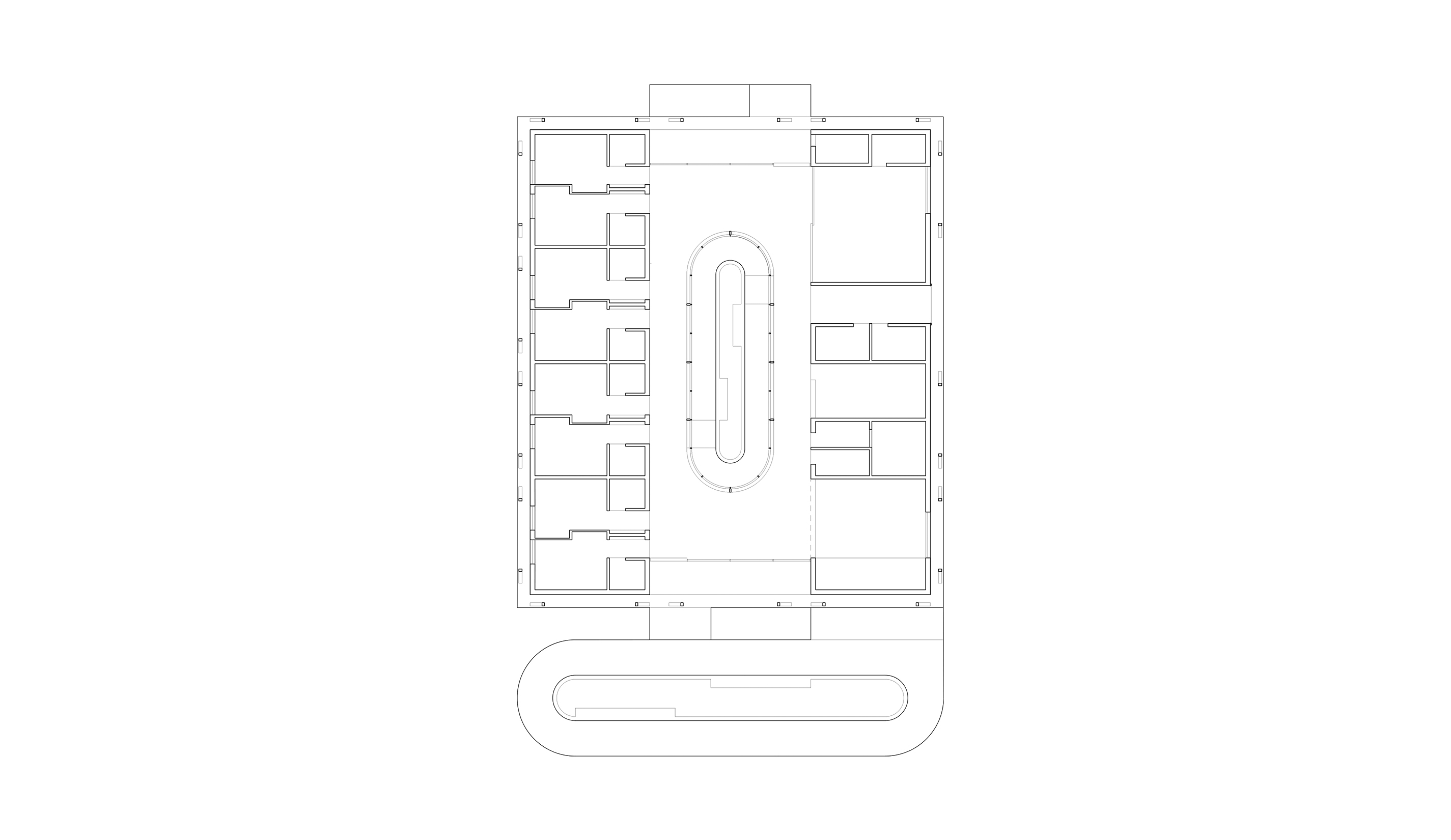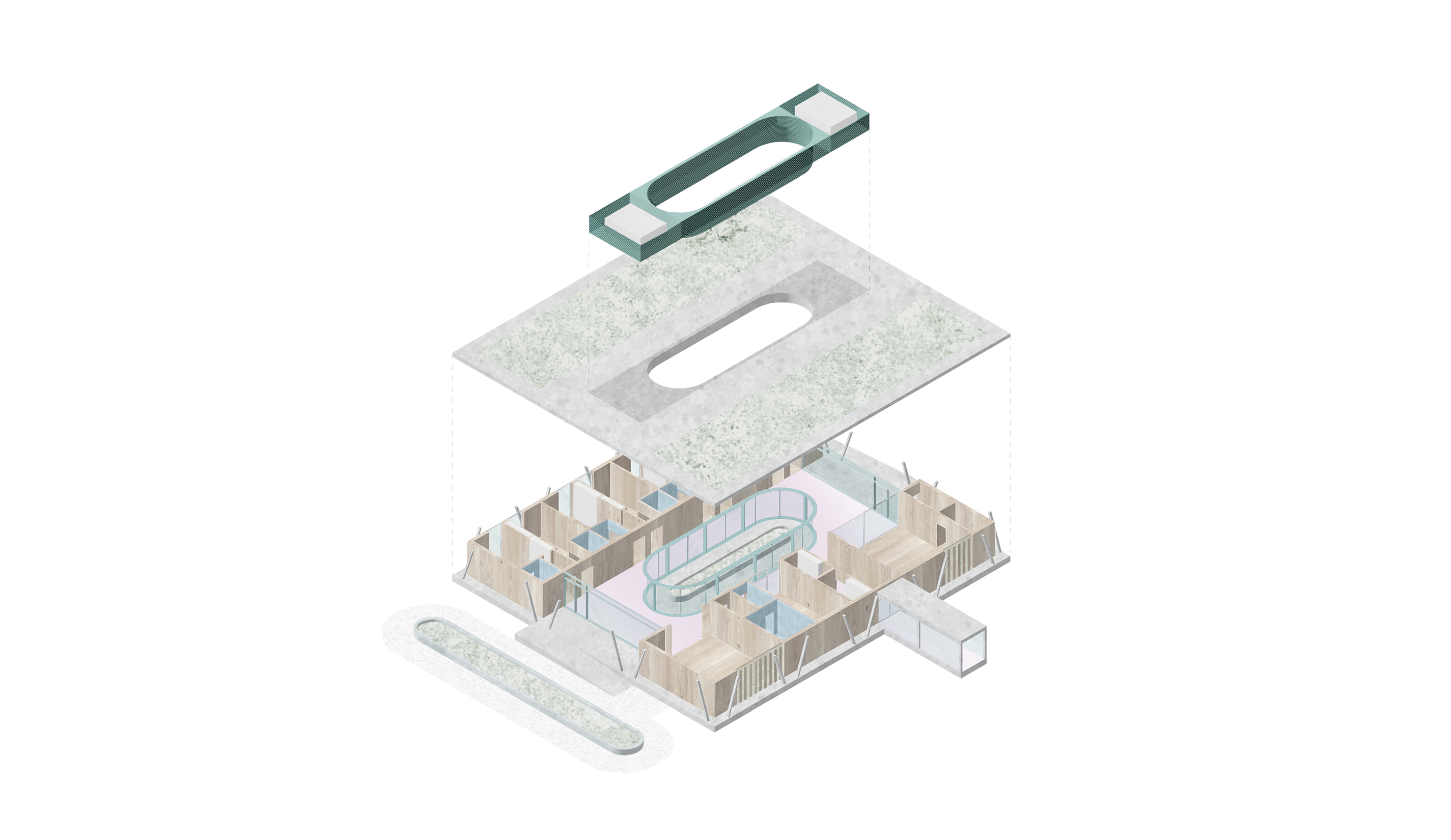 The core concept underlying the architectural proposal is the creation of a "pavilion in the green", a building capable of connecting with its surrounding environment and deriving the maximum possible benefit from it, both in terms of the quality of its interior spaces and its interactions with the exterior. The idea is to develop a residential complex where one can "live in nature," in direct contact with its colors and sounds throughout the changing seasons, while still being within a technologically advanced, innovative structure tailored to the specific needs of its residents. The overall design seeks to establish a direct and continuous interaction between indoor and outdoor spaces. A north-south axis running through the building, visually linking the southern garden to the hillside, serves as the "spinal column" of the new architecture. Along this axis, the most public areas of the building are organized, naturally extending into the surrounding landscape. A long, narrow garden courtyard is integrated along this axis, enhancing its significance and providing natural light to the innermost spaces; it occupies the heart of the building as a green insertion within the architecture. This open-air space features a central planted flowerbed, around which one can walk. Defined by a floor plan free of sharp corners, the garden courtyard shapes the main horizontal circulation of the building while also guiding the internal wandering experience, ensuring that every pathway remains visually connected to the greenery.