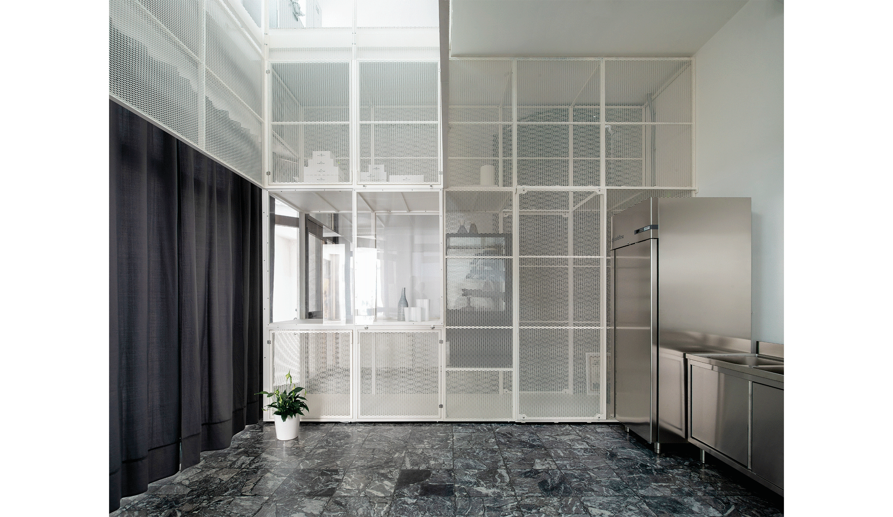 The gastronomic laboratory is part of an ambitious urban regeneration project launched by the Municipal Administration. The aim is to incentivise the reclamation process of the city’s derelict real-estate heritage and the revival of abandoned areas of the city, in order to return them to the community and promote their use for creative and innovative entrepreneurial activities. The selected space for the new laboratory is one of many unused spaces along Galleria Vidussi, a central sheltered pedestrian route once bustling with commercial activity and now sunk into a state of utter decay. The intervention envisaged the occupation of a free space of approximately 100 square metres split on two levels, both facing the main route of the Galleria. The critical issues confronted were the scarcity of natural lighting, drawn exclusively from the upper floor, and the single-compartment spatial conformation to be redistributed between customer area, production area, and storage area. The limited budget available for the intervention suggested a concise strategy, capable of addressing the spatial and programmatic complexities through a single action. Evocative of an installation by Berndnaut Smilde, the project is conceived as a cloud trapped within a pre-existing space. The cloud-system is achieved through a three-dimensional element composed from metallic tubular structures coated in sheets of metal mesh, fixed with lightness and spontaneity between the two floors, resolving at once technical necessities regarding both compartmental satiation and illumination. A ‘furniture piece’ that defines and distinguishes functional spaces with precision, while maintaining between them a strong visual relation, dissolving and dematerializing their boundaries. A “luminous machine” that gathers natural light from the upper floor to make it reverberate in the central double-height void, spilling delicately into the lower spaces. The resultant atmosphere is clear, luminous, serene and evanescent; the privileged experience of working submerged in a cloud.