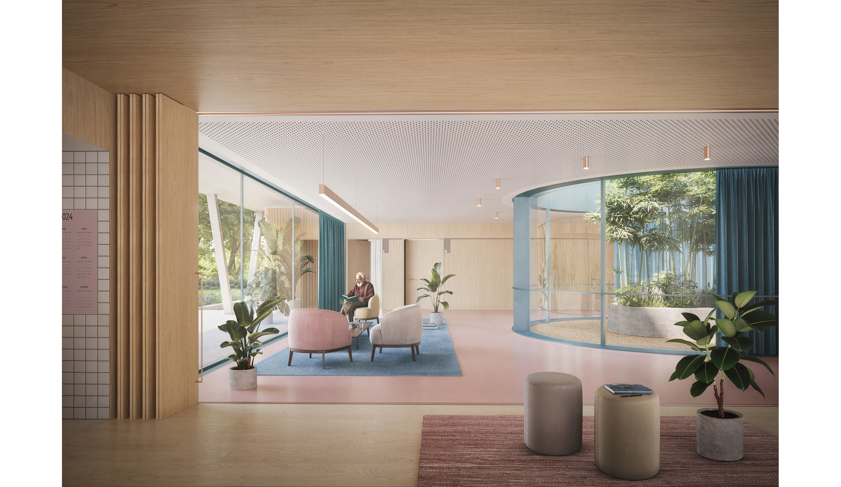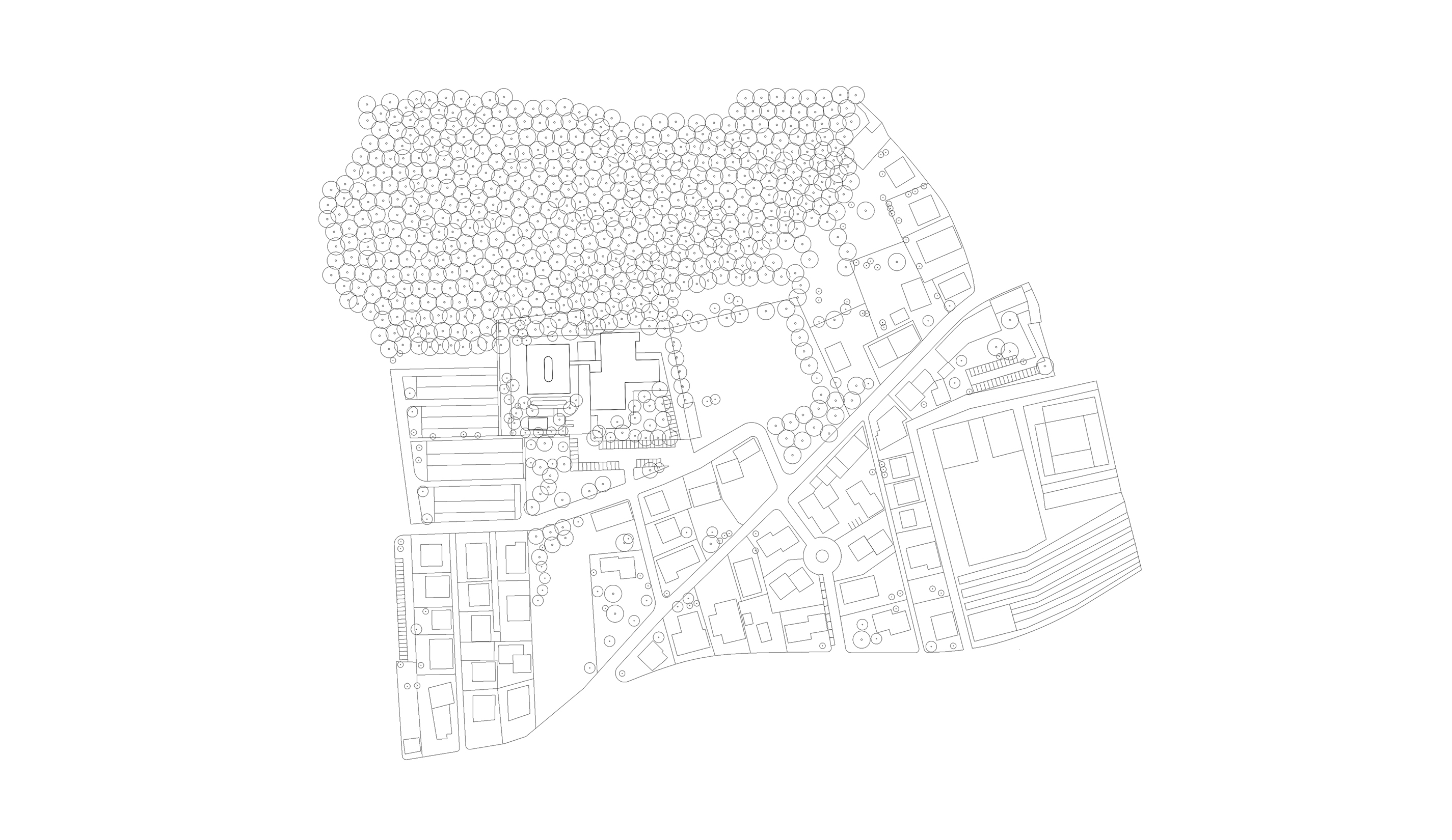 The core concept underlying the architectural proposal is the creation of a "pavilion in the green", a building capable of connecting with its surrounding environment and deriving the maximum possible benefit from it, both in terms of the quality of its interior spaces and its interactions with the exterior. The idea is to develop a residential complex where one can "live in nature," in direct contact with its colors and sounds throughout the changing seasons, while still being within a technologically advanced, innovative structure tailored to the specific needs of its residents. The overall design seeks to establish a direct and continuous interaction between indoor and outdoor spaces. A north-south axis running through the building, visually linking the southern garden to the hillside, serves as the "spinal column" of the new architecture. Along this axis, the most public areas of the building are organized, naturally extending into the surrounding landscape. A long, narrow garden courtyard is integrated along this axis, enhancing its significance and providing natural light to the innermost spaces; it occupies the heart of the building as a green insertion within the architecture. This open-air space features a central planted flowerbed, around which one can walk. Defined by a floor plan free of sharp corners, the garden courtyard shapes the main horizontal circulation of the building while also guiding the internal wandering experience, ensuring that every pathway remains visually connected to the greenery.